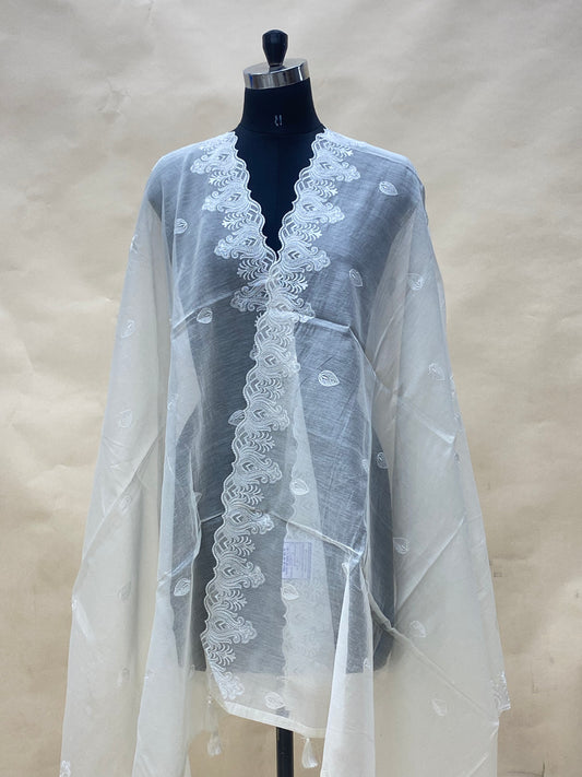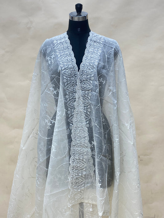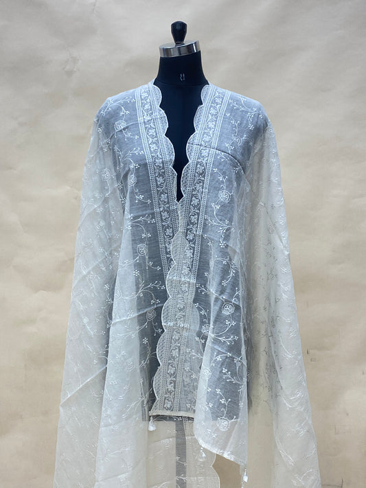 Beautiful Elegant Floral Thread Embroidery On Off White Chanderi Dupatta