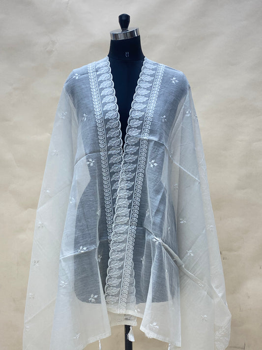 Classic Delicate Floral Thread Embroidery On Off White Chanderi Dupatta