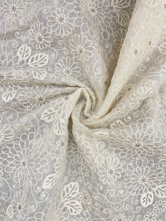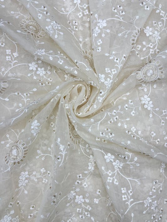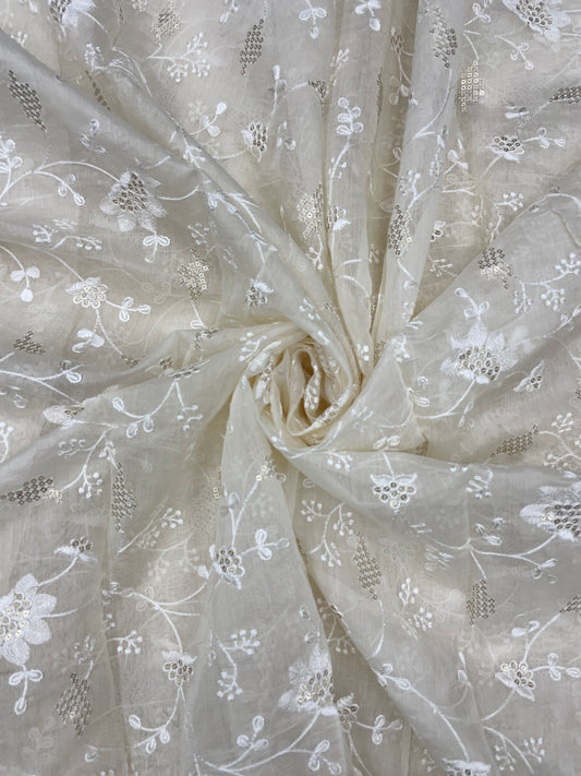 Amazing Fantastic Floral White Thread Embroidery With Zari And Sequin Work On White Dyeable Chanderi Silk Fabric