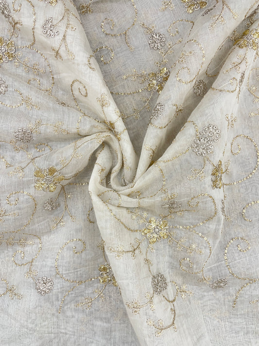 Stunning Elegant White Thread And Golden Sequin Work On Dyeable Chanderi Fabric