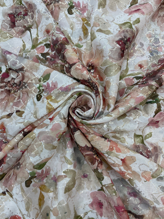 Beautiful Floral Print Embroidery With Sequins On Chinon Fabric