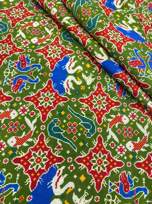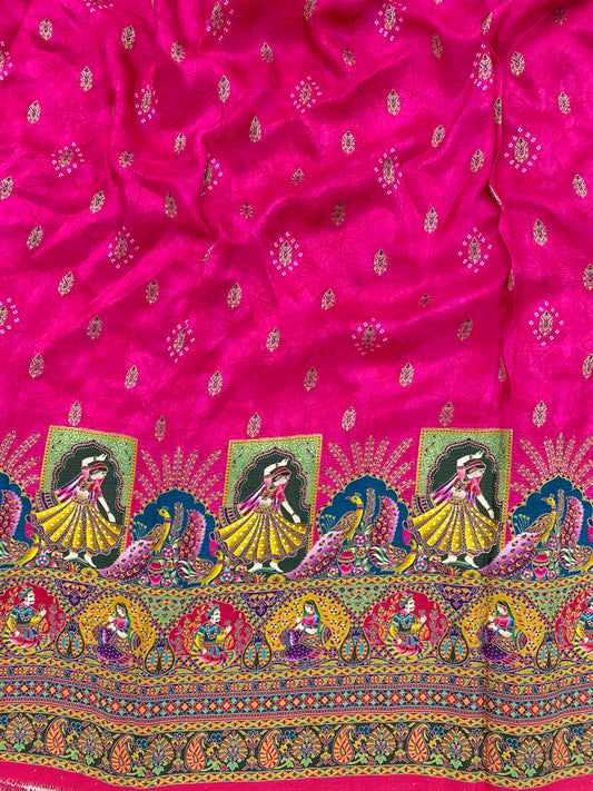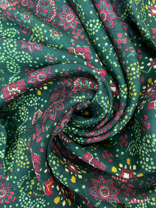 Lavish Extraordinary Traditional Bandhani Print On Green Color Dola Silk Fabric