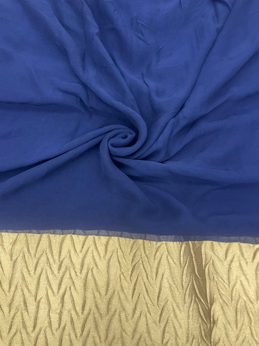 Subtle Yet Elegant Plain Blue Dye With Heavy Golden Border On Georgette Fabric