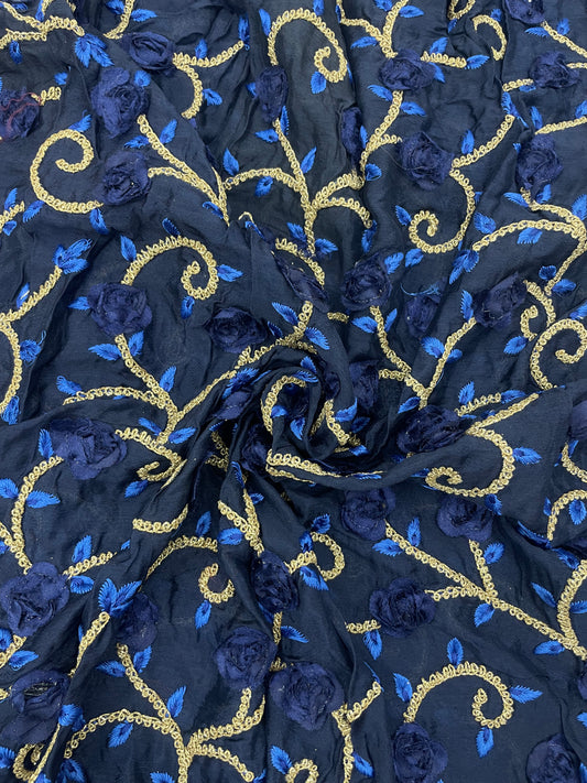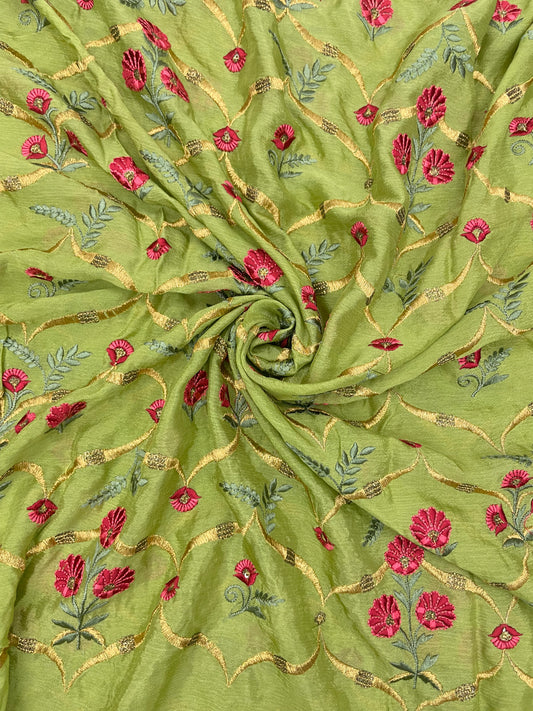 Delicate Traditional Colorful Floral Thread Embroidery With Golden Zari Work On Chinon Fabric