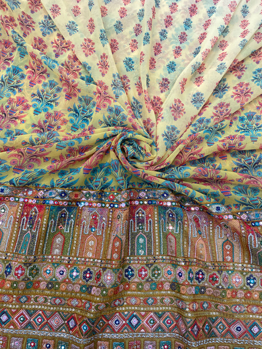 Superb Vibrant Multi Ethnic Print With Multi Color Thread Embroidery And Sequin And Faux Work On Georgette Fabric
