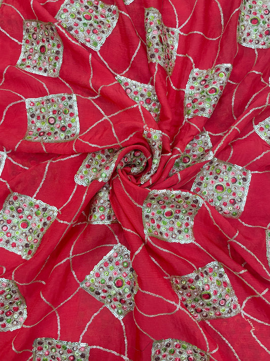 Superb Classic Minimal Spiral Colorful Thread Embroidery With Sequin Work All Over Chinon Fabric