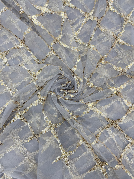 Shiny Attractive Criss Cross Golden Multi Sequin Work All Over Grey Net Fabric
