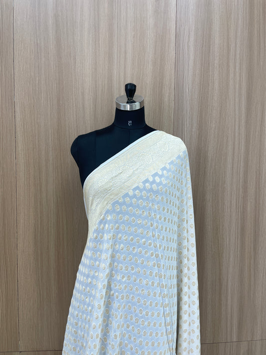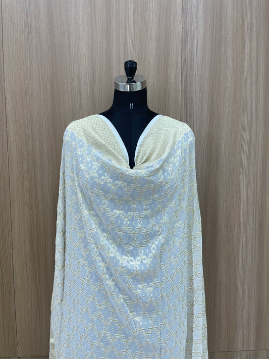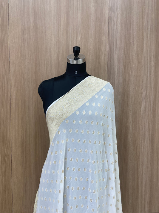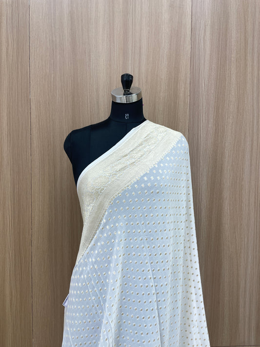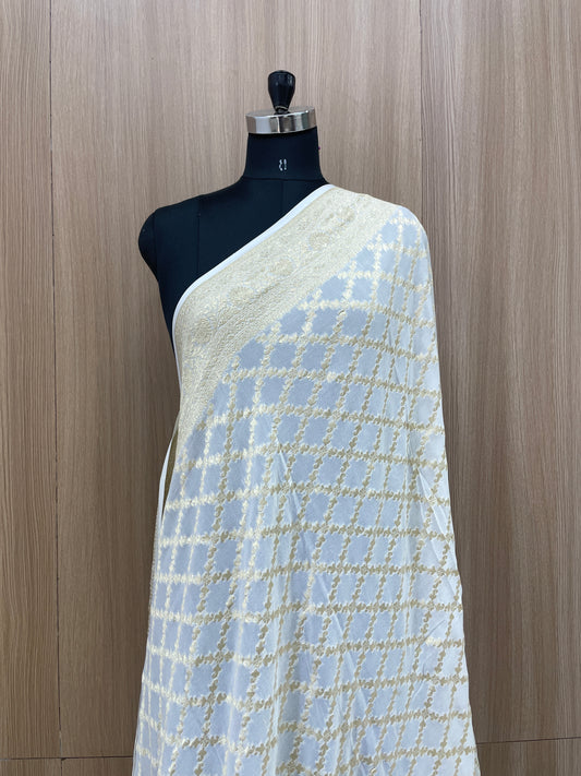 Subtle Yet Elegant Diamond Shaped Golden Zari Jacquard Weaving On White Dyeable Pure Georgette Dupatta