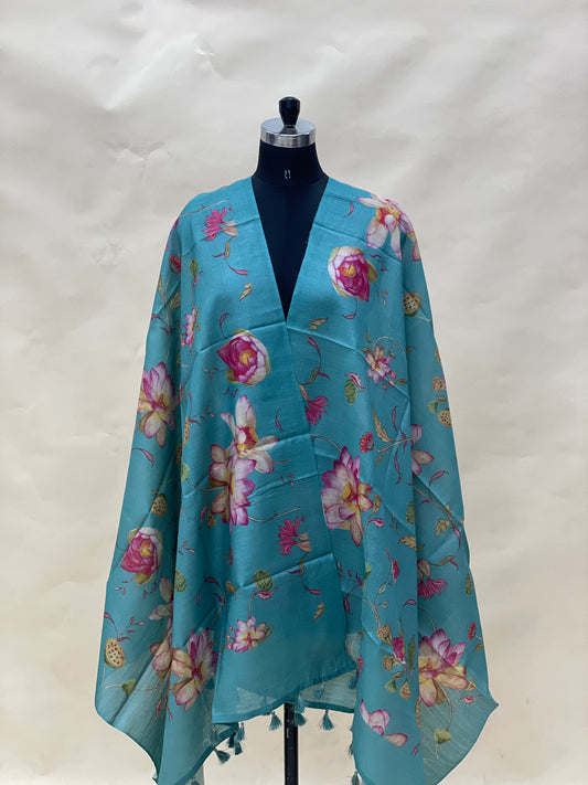 Classic Pretty Floral Multicolored Print With Hanging Tassels On Munga Tussar Dupatta