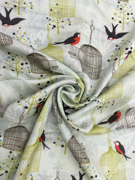 Exquisite Unique Cage And Bird Figure Print On Satin Fabric
