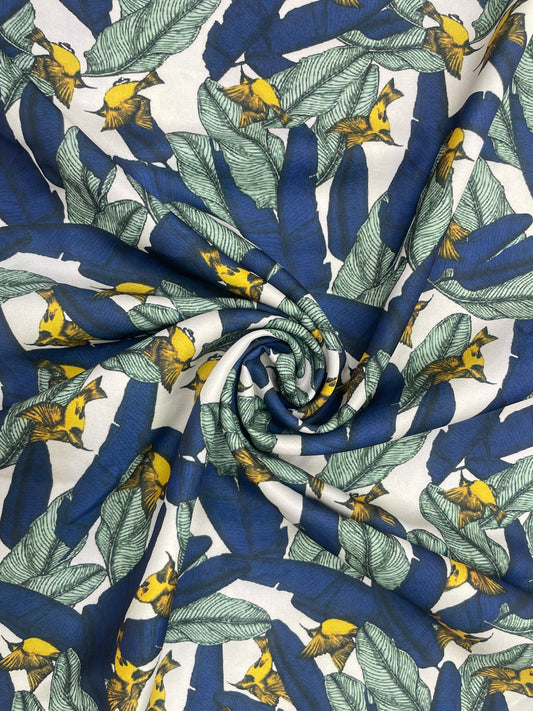 Magnificent Premium Bright Leaves And Bird Print All Over Satin Fabric