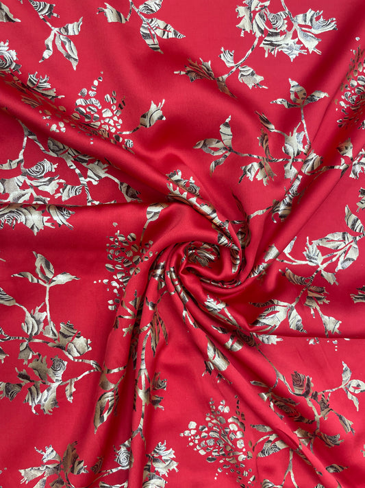 Luxurious Shiny Beautiful Rose Foil Print On Red Satin Fabric