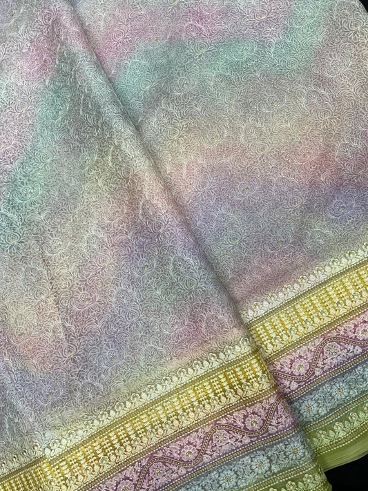 Multi Color Shibori Print With Zari Work And Jacquard Weaving On Chiniya Silk Fabric