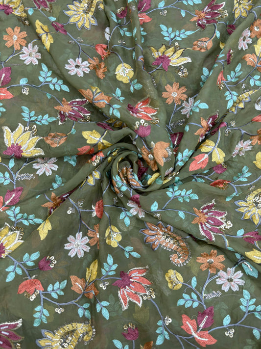 Attractive Elegant Floral Multithread Embroidery With Hand Work On Organza Fabric