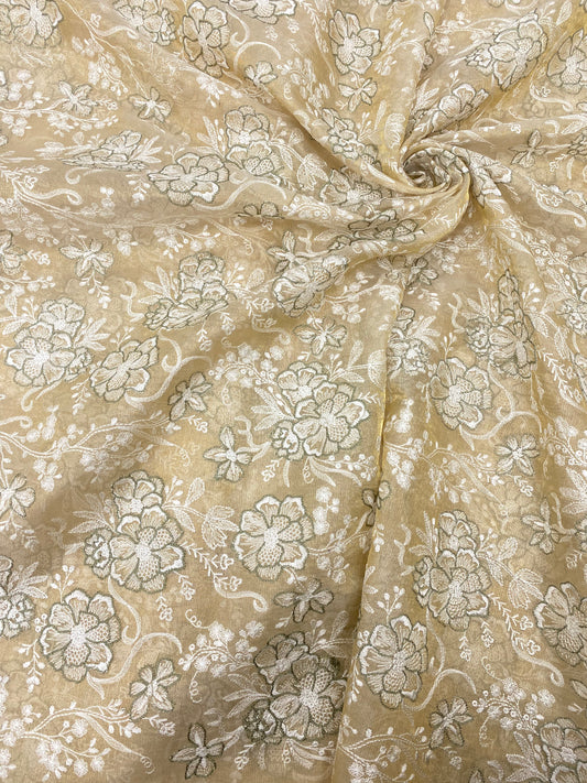 Superb Eye Catching Floral White & Green Thread Embroidery On Dyeable Tissue Fabric
