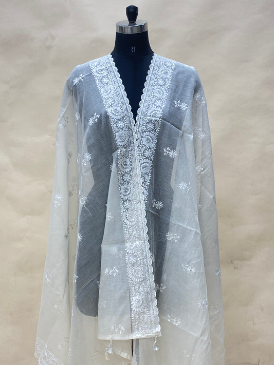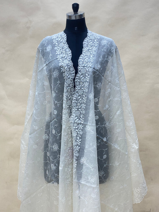 Beautiful Elegant Floral Thread Embroidery On Off White Chanderi Dupatta
