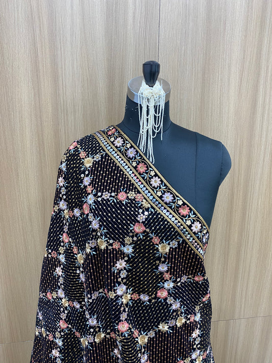 Exclusive Premium Heavy Colorful Floral Thread Embroidery With Golden Sequin Work On Velvet Dupatta