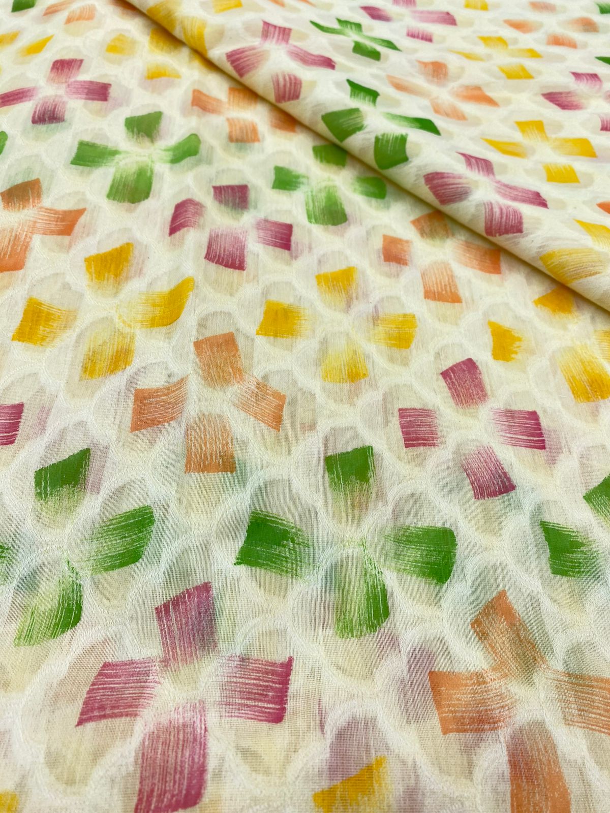 Discover the artistic elegance of Hand Brush Painted Chanderi Brocade Fabric, a graceful fusion of traditional craftsmanship and contemporary creativity, thoughtfully presented by Banaraswala Fabrics. This exquisite fabric celebrates the sheer delicacy of Chanderi brocade, elevated with expressive hand brush painting that adds a unique, artisanal charm to every yard.