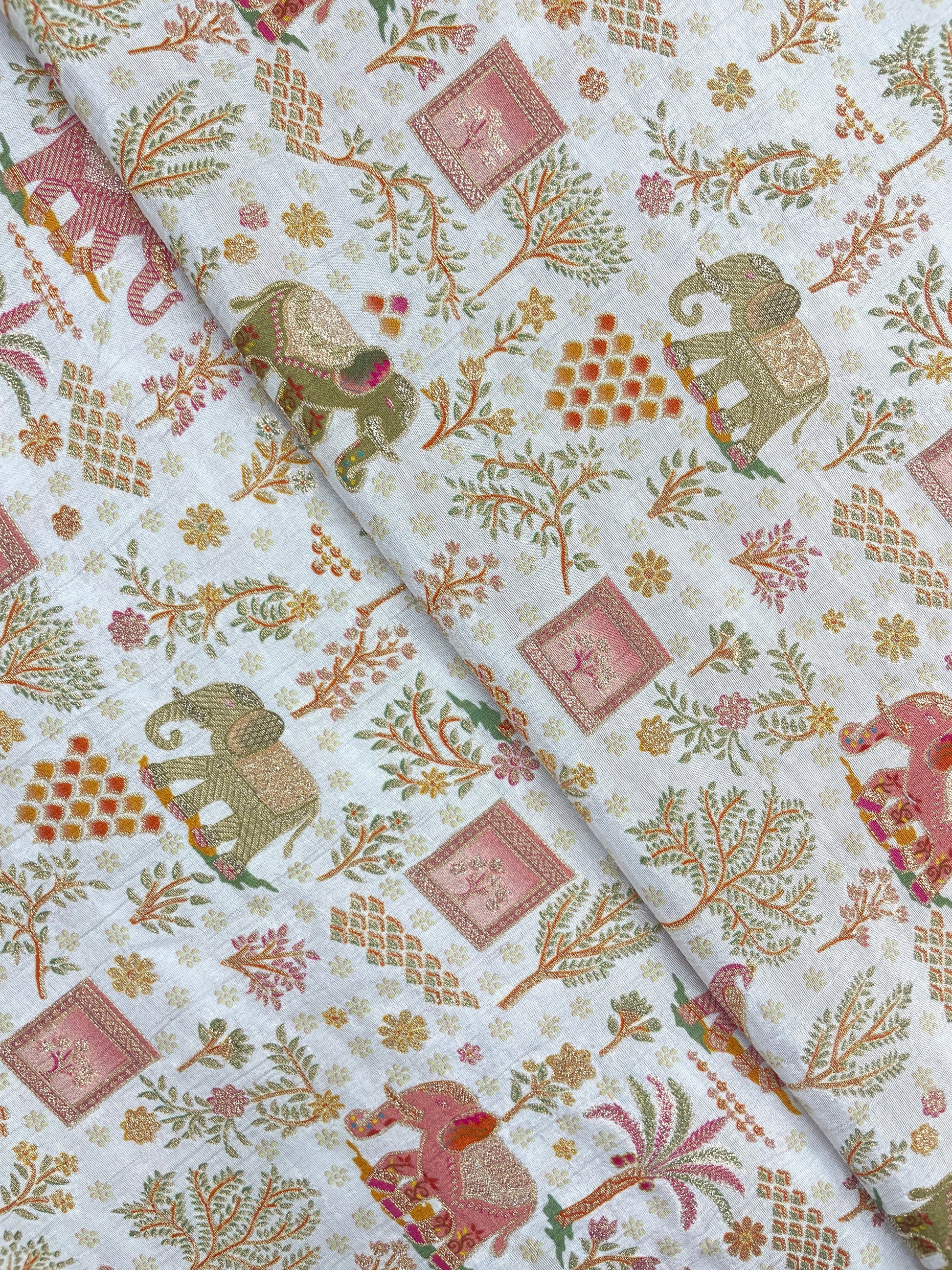 The mesmerizing build of this fabric makes it appealing. Banaraswala's Digital Print Art Dola Silk Fabric is a blend of polyester and silk threads for exceptional strength and desired texture. This incredible fabric has a great fall, with slight sheerness for the right kind of elegance. The super airy fabric of dola silk feels tender against your skin and sends soothing waves of delight throughout your being. You can use this fabric to make suits, Kurtis, maxi, gowns, coordinated sets, scrunches, and a lot more.