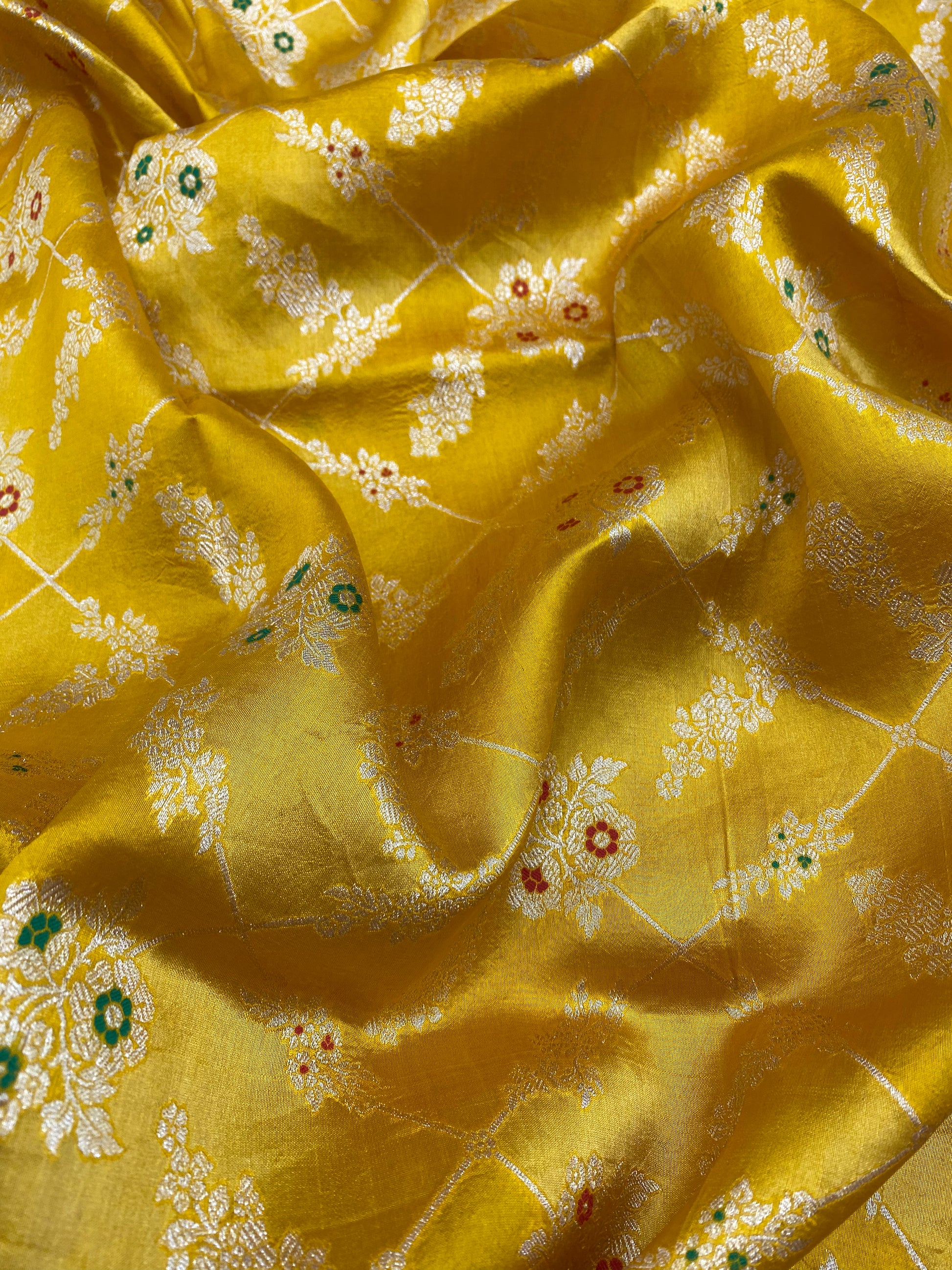 Exclusive Pretty Floral Patterned Golden Zari Weaving On Pure Silk Tissue Fabric
