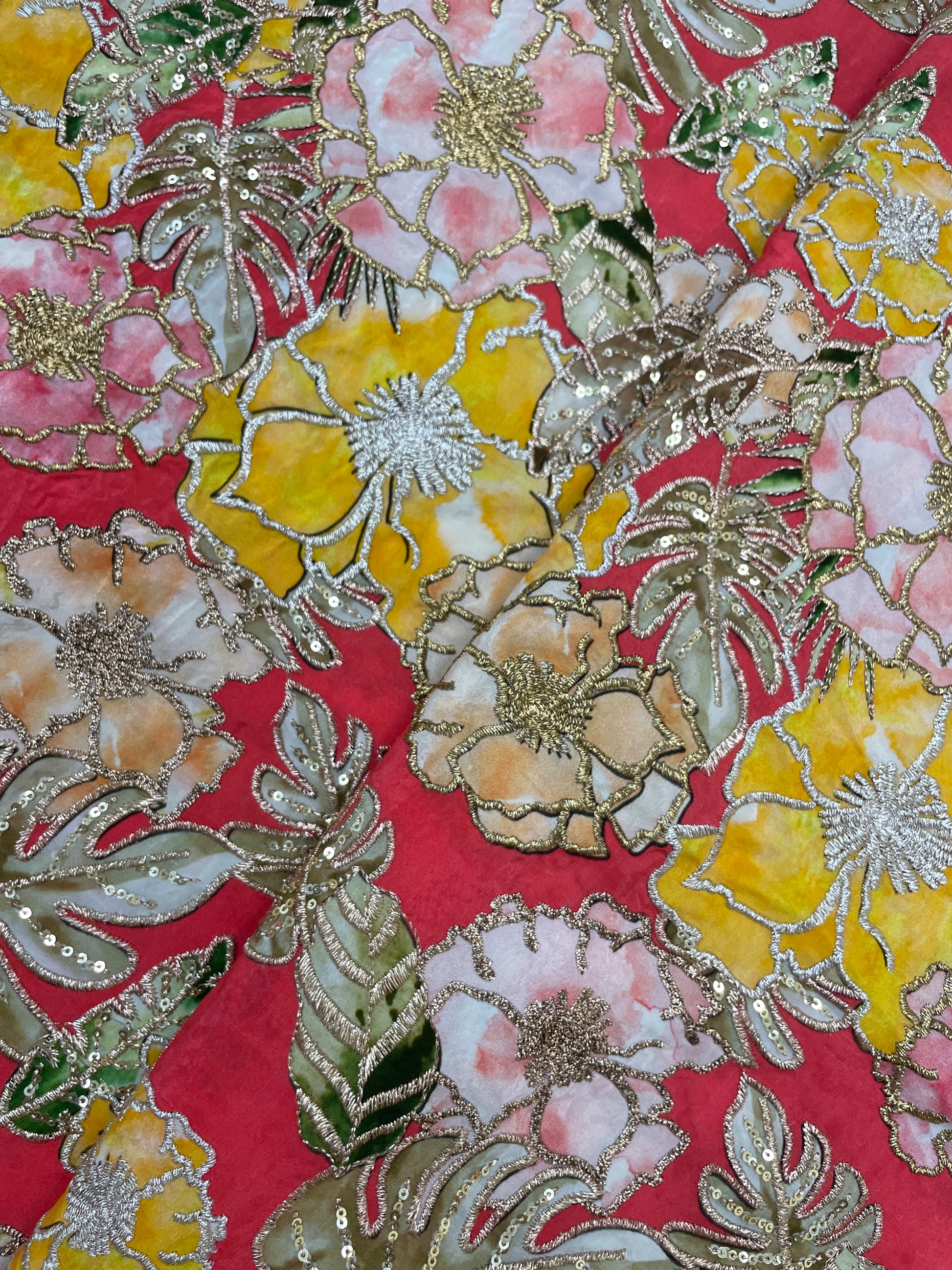 Fancy Elegant Floral Print Position Embroidery On Crepe Fabric