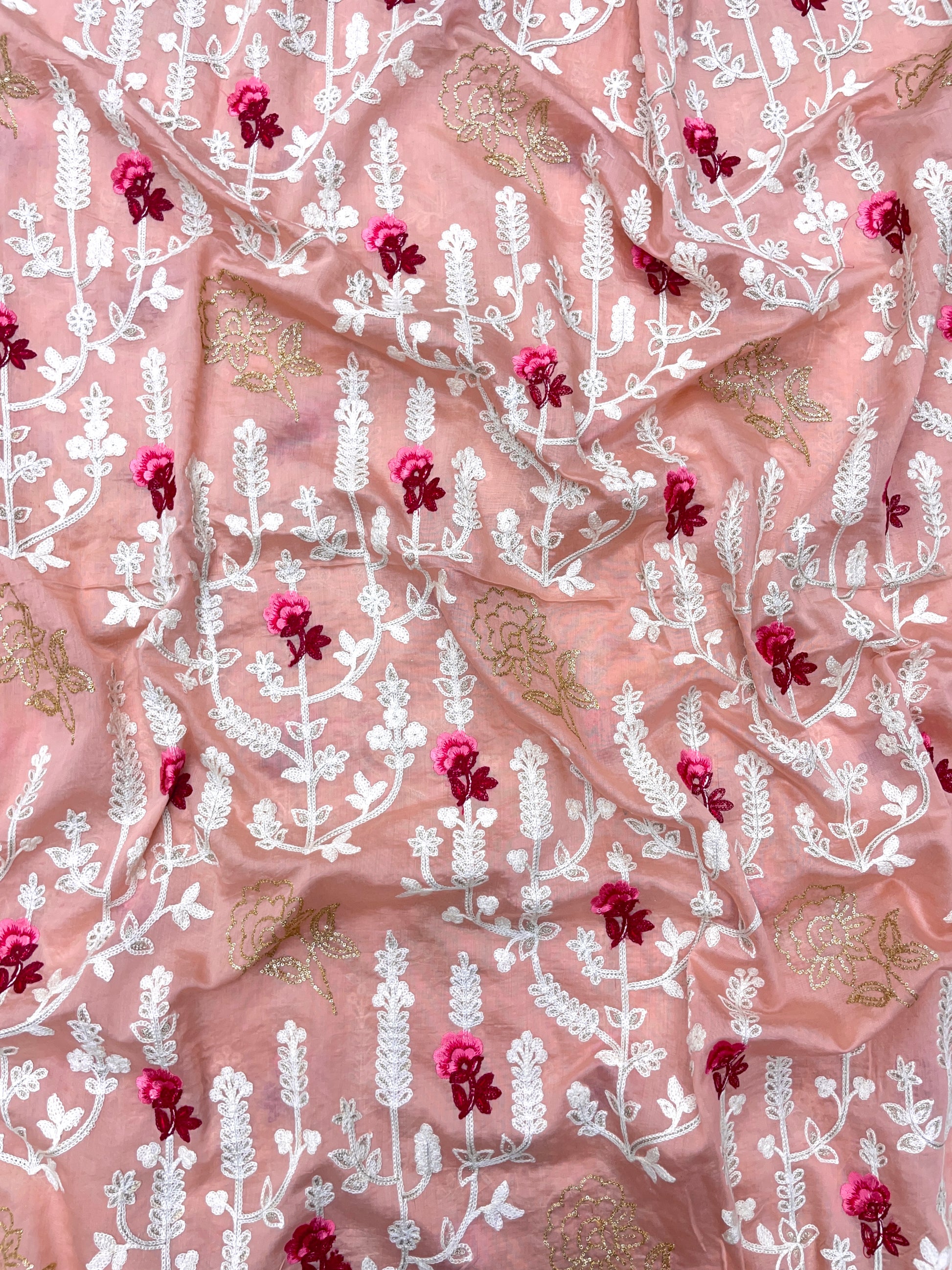 Banaraswala's Embroidery High quality Chinon fabric is Mercerized and Dyed with high quality dyes to ensure vibrant colours and very good colour solidity. Chinon fabric gives the wearer a slimming appearance and has a very graceful fall, making it a great fabric comfortable for party events and other formal occasions.