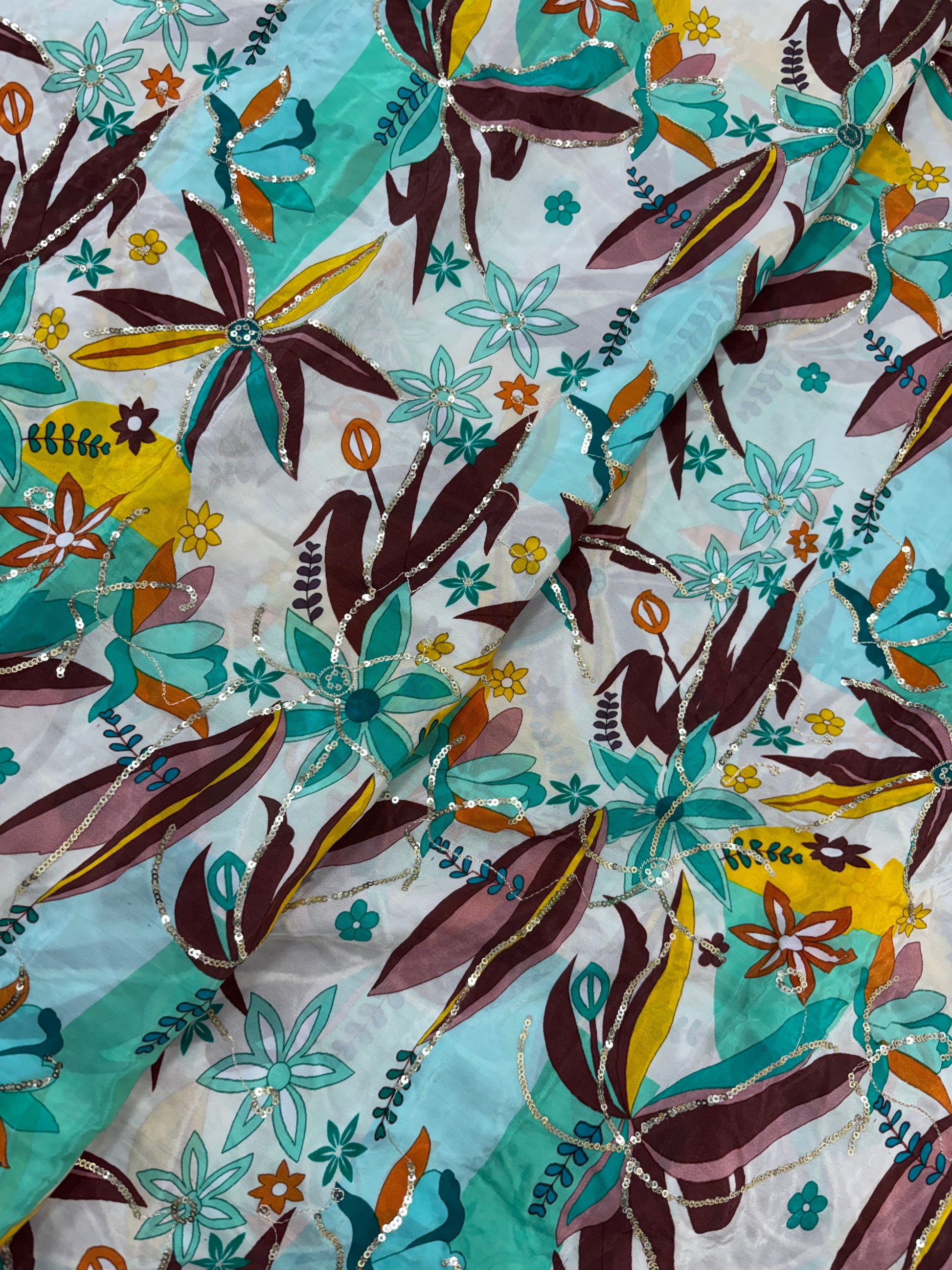Pleasing Pretty Multi Color Floral Print With Zari Work On Crepe Fabric